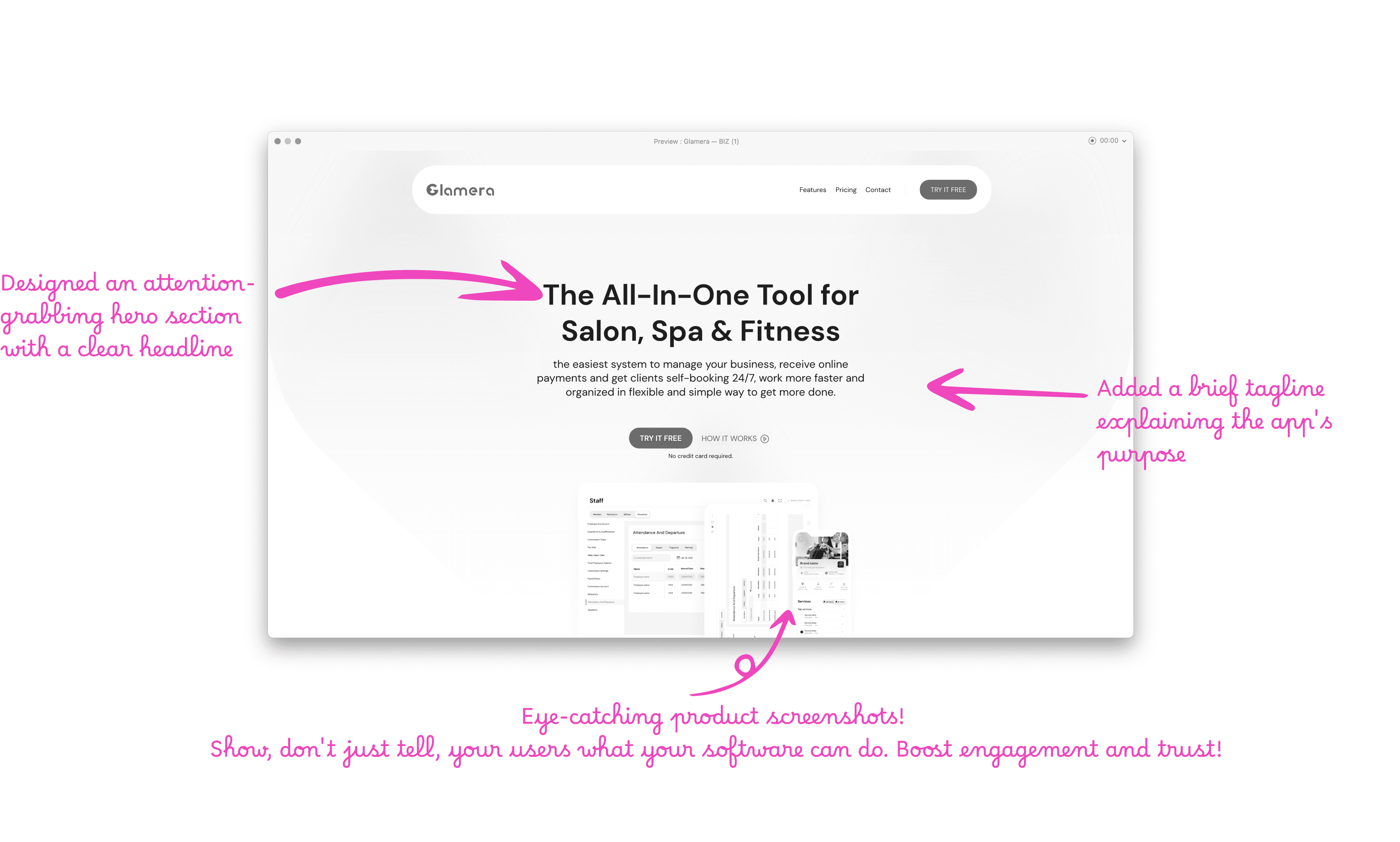 The Challenge: Glamera is an innovative SaaS platform that empowers beauty service providers, including barber shops, beauty salons, spas, and gyms. As a UX designer, my role was to improve the user experience of Glamera's landing page.